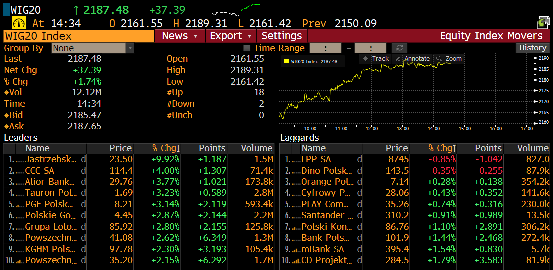 WIG20 korzysta na fali pozytywnych globalnych nastrojów