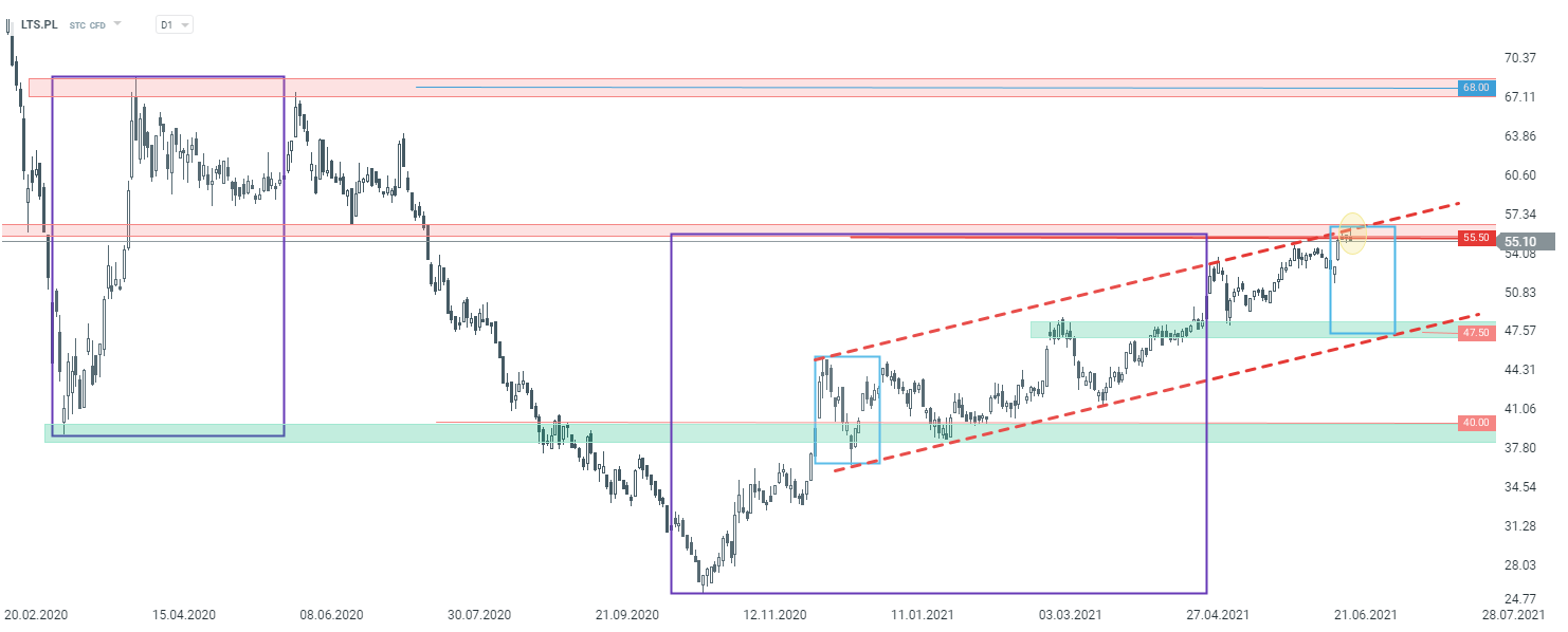 W dzisiejszej analizie przyjrzymy się sytuacji technicznej na spółce Lotos (LTS.PL), gdzie notowania mają wyraźny problem z pokonaniem kluczowej strefy oporowej (55,50 zł). Patrząc na interwał D1, kurs odbija się od obszaru wynikającego z górnego ograniczenia szerokiej geometrii 1:1 (fioletowe prostokąty), oraz górnego ograniczenia kanału wzrostowego, jak i wcześniejszych reakcji cenowych. Jeżeli sprzedającym uda się przejąć w tym miejscu inicjatywę, niewykluczony będzie ruch korekcyjny w kierunku wsparcia przy 47,50 zł.