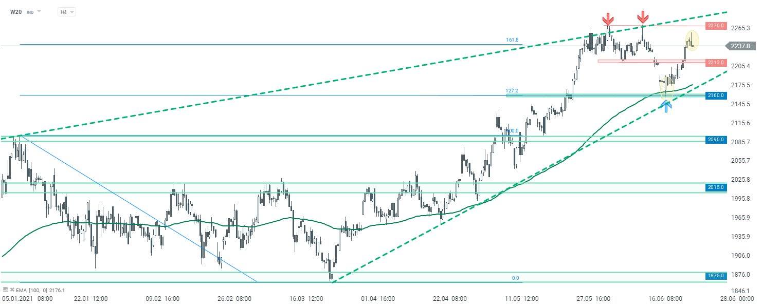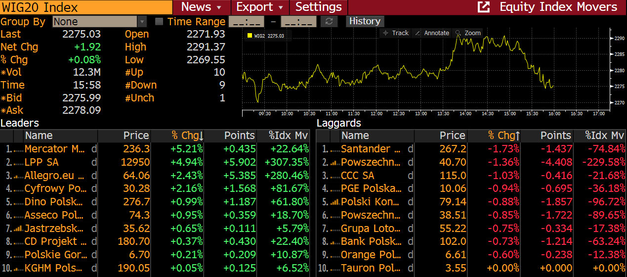 Podczas ostatniej sesji w tym tygodniu handlowym możemy obserwować mieszane nastroje na rynku akcji w Europie. Główne indeksy ze Starego Kontynentu poruszają się bez wyraźnego kierunku. W momencie przygotowywania tego komentarza niemiecki DAX traci 0,12%, z kolei londyński FTSE 100 zyskuje 0,32%, podczas gdy francuski CAC40 zniżkuje 0,3%. Sytuacja na Giełdzie Papierów Wartościowych w Warszawie prezentuje się nieznacznie lepiej, indeks WIG20 rośnie około 0,13% na godzinę przed zamknięciem handlu. Warto także zauważyć, że podczas wczorajszej sesji polski indeks WIG znalazł się na najwyższych poziomach w historii, przekraczając maksimum z 2018 roku. Wracając do indeksu blue chipów, ten zamknął się wczoraj ponad 1,7% wyżej, tym samym w przypadku utrzymania pozytywnego sentymentu, w najbliższym czasie niewykluczony jest atak na czerwcowe szczyty.