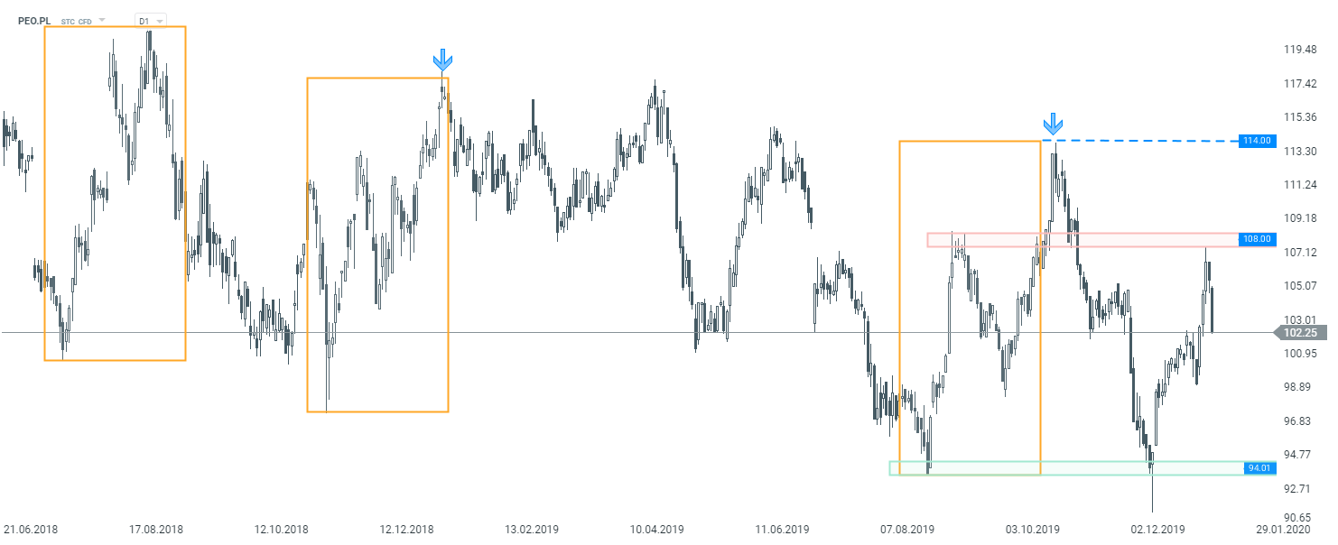 Bank Polska Kasa Opieki SA (PEO.PL) jest jedną z najgorzej radzących sobie spółek z WIG20, dzisiejsze spadki przekraczają 2%. Jeśli spojrzymy na sytuację techniczną, jest ona zbliżona do tej, którą obserwujemy na WIG20. Kurs po nieudanym próbie wybicia strefy oporu przy poziomie 108 zł, dynamicznie zawrócił. Ponadto walor od dłuższego czasu znajduje się w tendencji spadkowej, a ostatnie 3 największe korekty były identyczne (pomarańczowe prostokąty), co potwierdza sentyment zniżkujący. Jeżeli obecne nastroje nie ulegną zmianie, spółka ma szansę na spadki w rejony ostatnich minimów przy poziomie 94 zł za jedną akcję. Oporem pozostaje wspomniana strefa przy 108,00 zł.