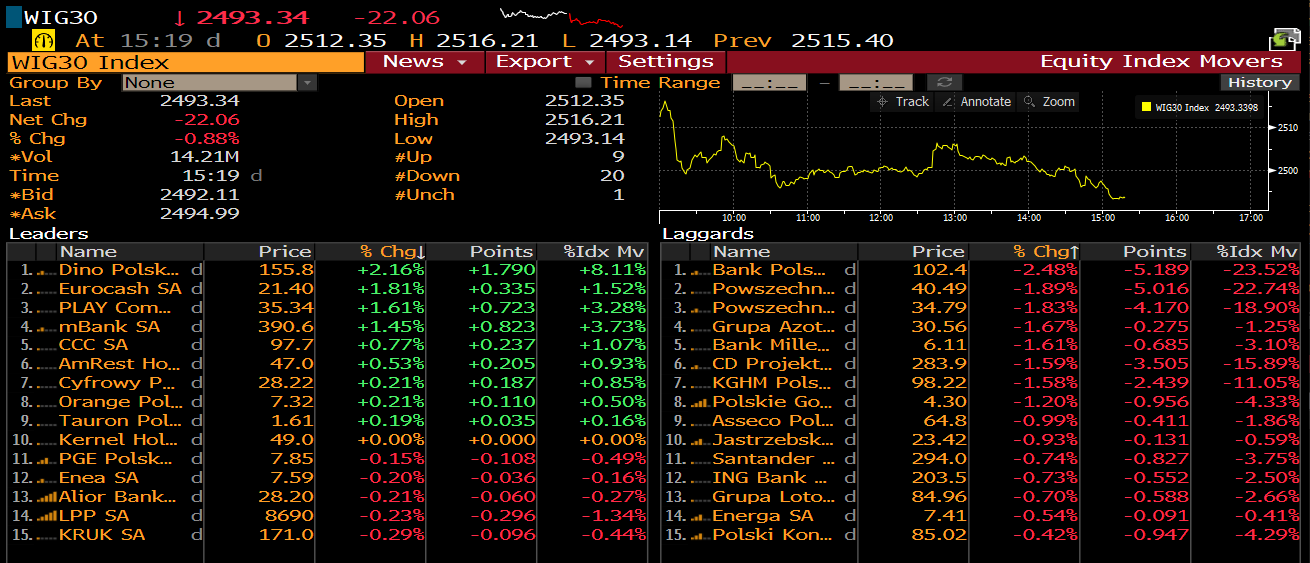 Większość spółek z indeksu WIG30 znajduje się dziś pod kreską. Źródło: Bloomberg