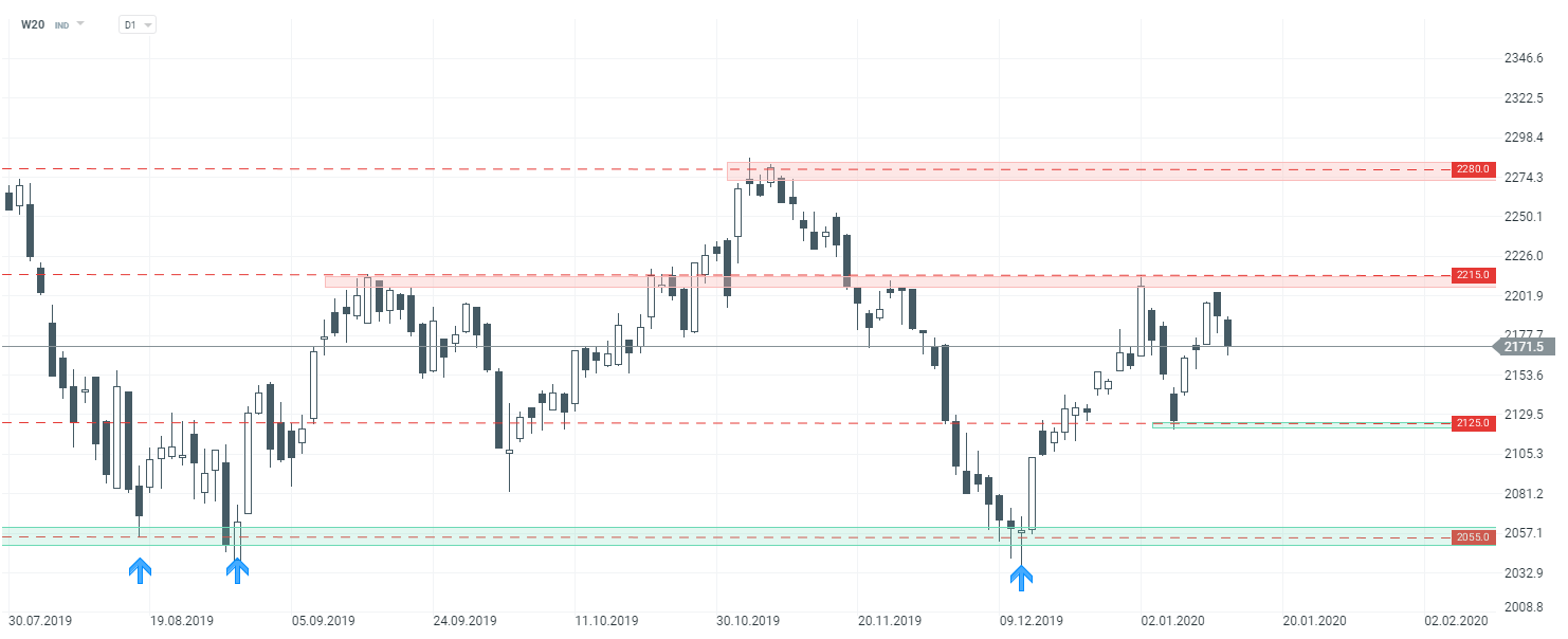Sytuacja techniczna na indeksie 20-stu największych spółek nie uległa zmianie. Dzisiejsza sesja rozpoczęła się od spadków i kolejne godziny nie przynoszą poprawy. Spoglądając na wykres, dzisiejsza przecena jest spowodowana przez obronę strefy oporowej przy 2215 pkt., o której pisaliśmy we wczorajszym artykule z cyklu Puls GPW. Jeżeli sentyment nie ulegnie poprawie, istnieje szansa na test dołków z 8 stycznia przy 2125 pkt.