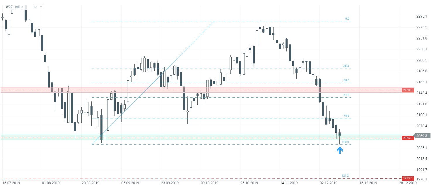 Zła passa nie opuszcza polskiej giełdy. W ujęciu rocznym WIG20 znajduje się 10% pod kreską, z kolei dziś spadki w pewnej chwili przekraczały 1%. Patrząc na wykres W20, notowania próbują odbijać od kluczowej strefy wsparcia. W obszarze zaznaczonym kolorem zielonym znajdują się historyczne reakcje ceny (między innymi z sierpnia). Jest to na z pewnością ciekawe miejsce do wykonania korekty wzrostowej, niemniej trzeba pamiętać, że główny trend jest spadkowy i wiąże się to z dużym ryzykiem. W przypadku wybicia dołem, ruch w dół może przyspieszyć. W przypadku takiego scenariusza, jako kolejne wsparcie należy wziąć pod uwagę poziom 1975 pkt, gdzie znajduje się mierzenie zewnętrzne 127,2% Fibonacciego.