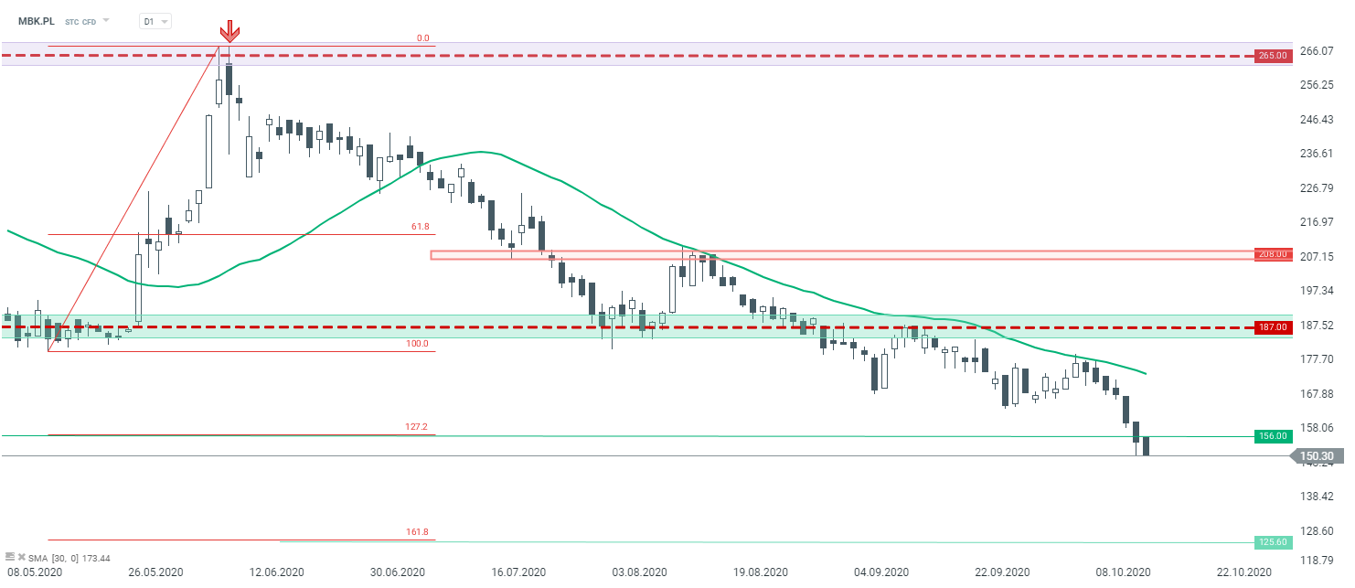 W dzisiejszej analizie przyjrzymy się sytuacji technicznej na spółce mBank (MBK.PL), który opuścił indeks WIG20 i został zastąpiony przez Allegro (ALE.PL). Kurs od dłuższego czasu znajduje się w silnej tendencji spadkowej, a w tym tygodniu ustanawiane są kolejne tegoroczne minima. Na obecnych poziomach kurs znajdował się połowie 2009 roku. Patrząc na interwał D1, wczoraj doszło do pokonania wsparcia przy poziomie 156 zł, gdzie wypadało mierzenie zewnętrzne 127,2% Fibonacciego, co zgodnie z założeniami analizy technicznej otwiera drogę w kierunku kolejnego współczynnika – 161,8% który znajduje się przy 125,60 zł. Aby myśleć o większych wzrostach notowania musiałyby wybić się powyżej średniej z ostatnich 33 okresów która w ostatnim czasie stanowiła kluczowy opór (zielona linia).