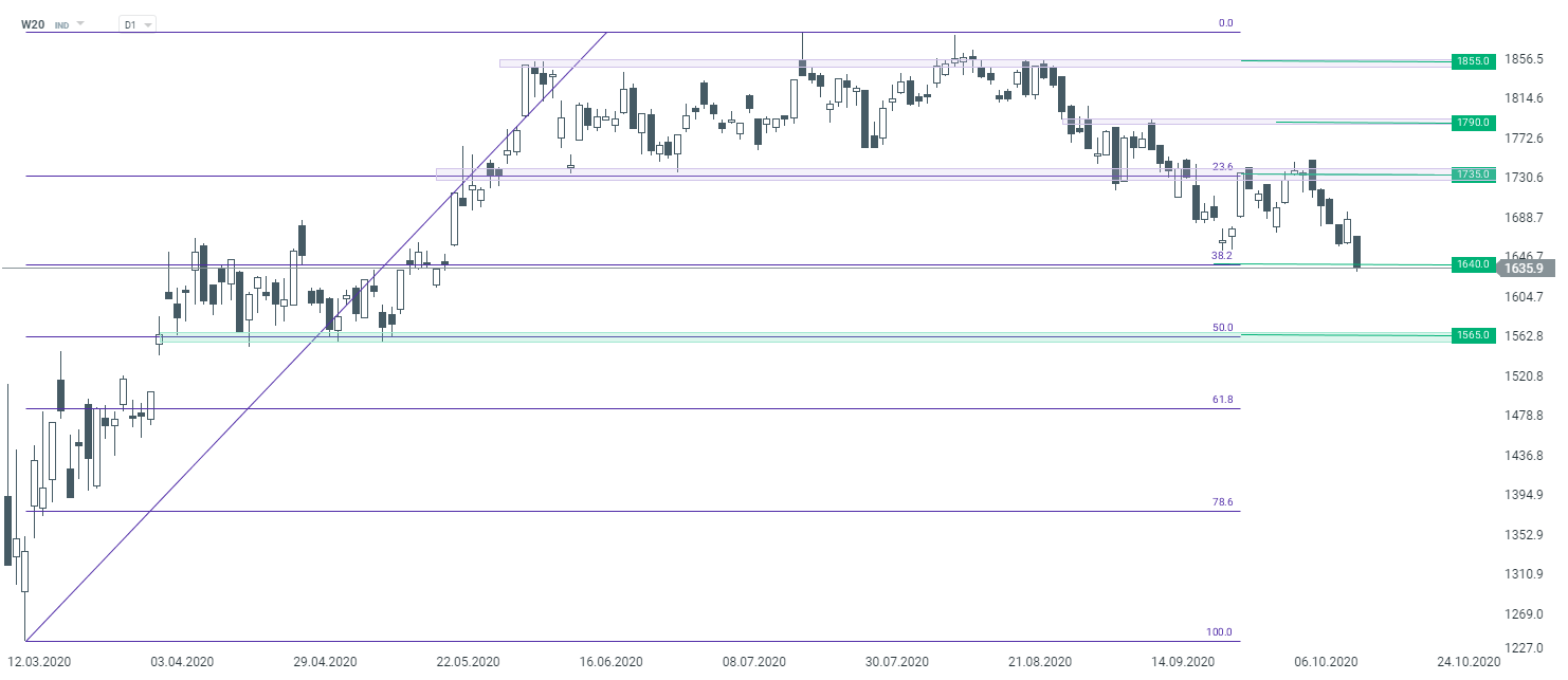 Patrząc z kolei na sytuację na indeksie dwudziestu największych spółek - WIG20 (W20), możemy kontynuację przeceny. Pomimo, że wczoraj notowania odbiły się od poziomu wrześniowych dołków, było to krótkotrwałe odreagowanie i dziś notowania znajdują się najniżej od maja tego roku. Sytuacja techniczna wciąż wygląda niekorzystnie dla rynkowych byków. Dopóki kurs utrzymuje się poniżej poziomu 1735 punktów, obowiązuje tendencja spadkowa. Lokalnie, testowane jest wsparcie wynikające z mierzenia 38,2% Fibonacciego, jego pokonanie może doprowadzić do pogłębiania przeceny.