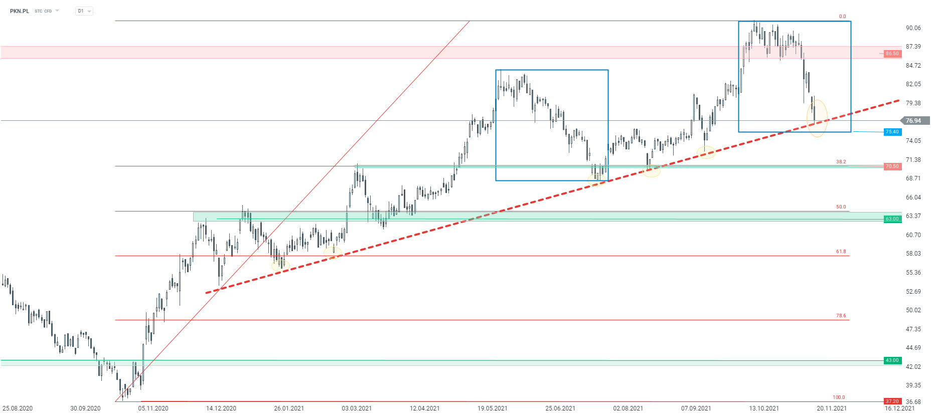 Patrząc z kolei na notowania PKN Orlen (PKN.PL), także obserwujemy dziś negatywny sentyment. Jeśli chodzi o interwał D1, notowania dotarły jednak do istotnego wsparcia, które wynika z linii trendu. W przypadku odbicia w tym miejscu, niewykluczony jest powrót do głównego trendu - wzrostowego. Z kolei jeśli dojdzie do wybicia dołem, jako kolejne ważne wsparcie powinniśmy traktować dolne ograniczenie układu 1:1 - okolice 75,40 zł.