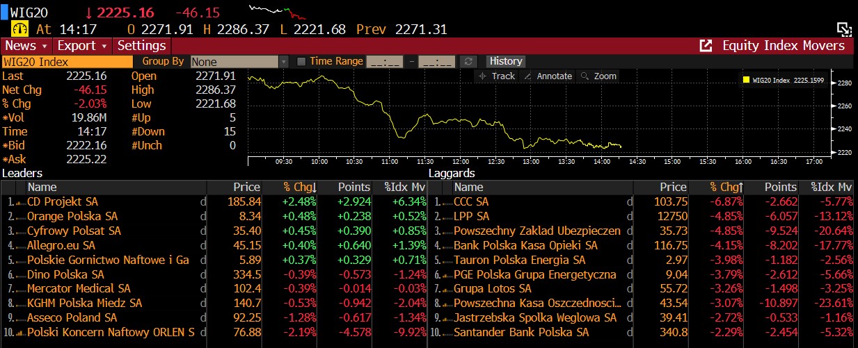 Spółki wchodzące w skład indeksu WIG20 i ich największe zmiany procentowe w ujęciu dziennym. Źródło: Bloomberg