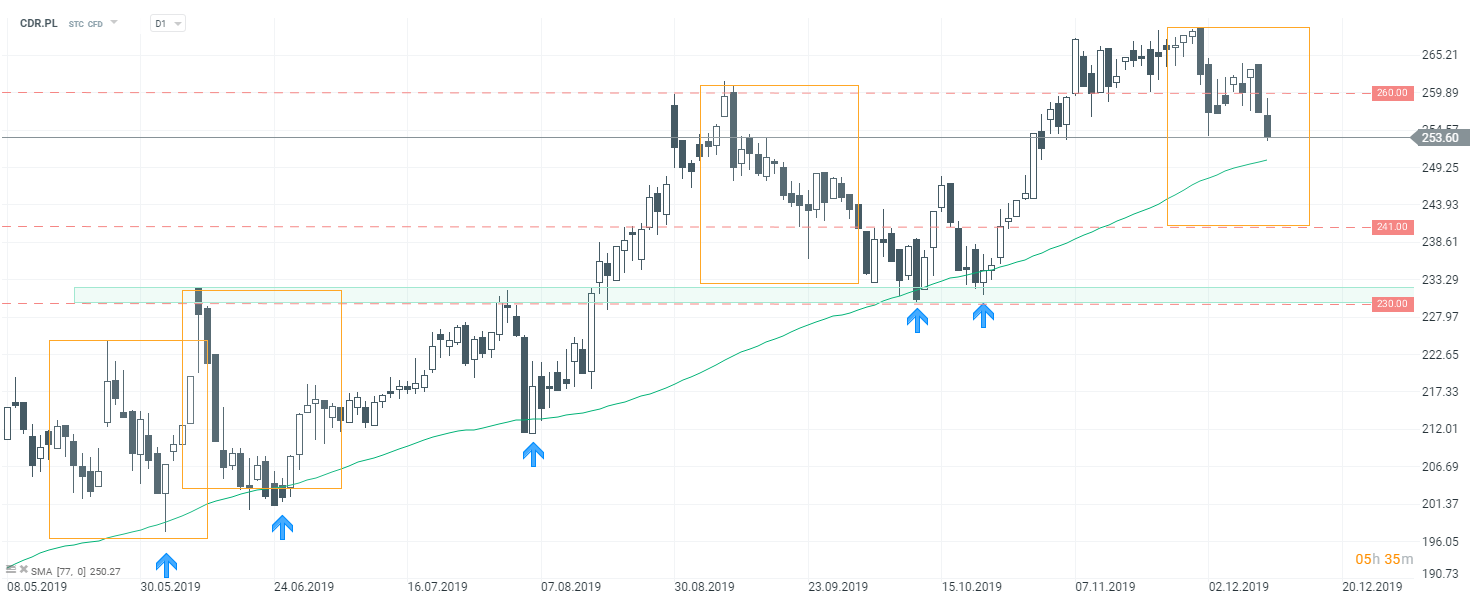 We wczorajszym artykule z cyklu “Puls GPW” wspominaliśmy o sytuacji technicznej na PGNiG, który dziś znalazła się na najniższych poziomach od 2012 roku. Jednak dziś skupmy się na innej spółce - CD Projekt. O tym, że istnieje ryzyko wykonania korekty spadkowej również wspominaliśmy w jednej z ostatnich analiz. Dziś spółka gamingowa traciła ponad 1,5%, tym samym mamy do czynienia z zejściem poniżej poziomu dołków z drugiego grudnia. Z perspektywy analizy technicznej wygląda na to, że istnieje szansa na większą korektę. Najbliższym wsparciem, które trzeba wziąć pod uwagę jest średnia SMA 77 ,która od dłuższego czasu trzymała wzrosty. Niemniej w przypadku głębszych spadków kluczowym wsparciem pozostaje dolne ograniczenie układu Overbalance przy 241 zł za akcję.