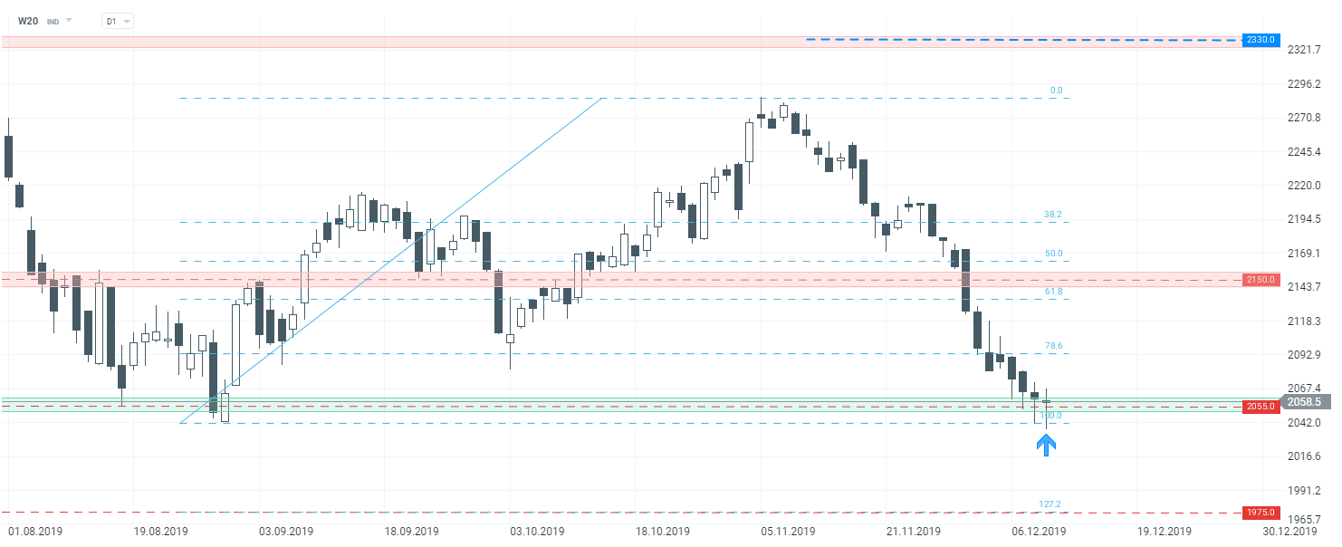 Spoglądając na sytuację techniczną na W20, kurs wyszedł dziś nieznacznie poniżej dolnego ograniczenia strefy wsparcia przy 2055 pkt. Niemniej reakcja popytu w drugiej połowie sesji napawa pewnym optymizmem. Wczorajsza sesja również zakończyła się świecą pinbar. Jeżeli korekta wzrostowa miałby się rozpocząć, jest to wręcz idealne miejsce. Z drugiej jednak strony, należy pamiętać, że na światowym rynku akcji wciąż panuje nerwowa sytuacja w związku z niepewnością co do stanu negocjacji handlowych pomiędzy USA i Chinami. W ostatnich dniach pojawiały się sprzeczne informacje co do tego czy ustalone na 15 grudnia opłaty celne zostaną wprowadzone w życie, czy też odroczone do przyszłego roku. Tak czy inaczej strefa wsparcia zaznaczona kolorem zielonym jest teraz kluczowa. Jeżeli dojdzie do jej obrony, to pierwszym celem dla korekty wzrostowej będzie powrót w rejony 2150 pkt. Jeżeli jednak poziom zostanie zanegowany, droga do 1975 pkt zostanie otwarta.