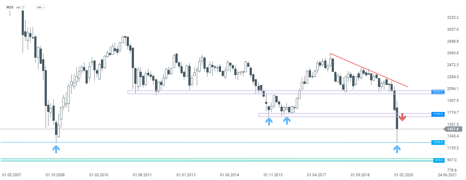 Sytuacja techniczna na indeksie największych spółek W20 nie uległa większej zmianie. Ostatnie spadki wyhamowały na wysokości poziomu 1250 pkt., gdzie znajdują się dołki z 2019 roku. Niemniej jest jeszcze za wcześnie, aby mówić o zakończeniu trendu spadkowego. Jeżeli doszłoby do większego odreagowania, jako kluczowy opór należy traktować strefę przy 1700 pkt. Tak długo jak notowania znajdują się poniżej, obowiązuje trend spadkowy. Wsparciem pozostaje wspomniany poziom 1250 pkt, gdyby jednak doszło do jego pokonania, kolejne kluczowe miejsce pod względem analizy technicznej znajduje się dopiero przy 960 pkt, wynika ono między innymi z minimów z 2001 roku.