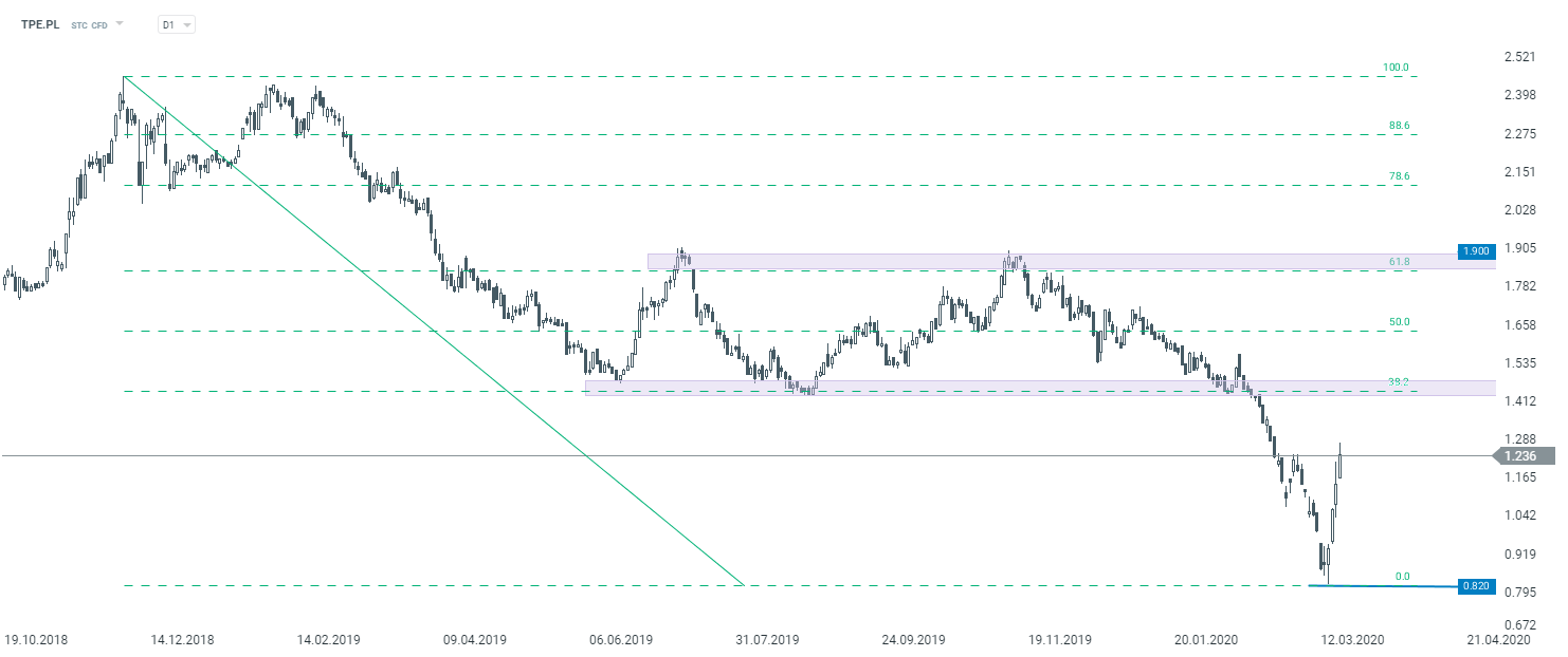 Spośród poszczególnych spółek, na uwagę zasługuje Tauron (TPE.PL), gdzie licząc od ostatnich minimów, doszło do odbicia o blisko 50%. Patrząc technicznie na wykres D1, istnieje szansa na ruch w kierunku oporu przy 1,45 zł. W tym miejscu znajdują się poprzednie minima oraz mierzenie 38,2% ostatniej fali spadkowej. Z kolei, gdyby wzrosty przybrały na sile i poziom oporu zostałby przebity, jako kolejna zaporę podażową należy traktować poziom 1,90 zł. W tym miejscu znajdują się poprzednie lokalne szczyty oraz współczynnik 61,8% Fibonacciego.