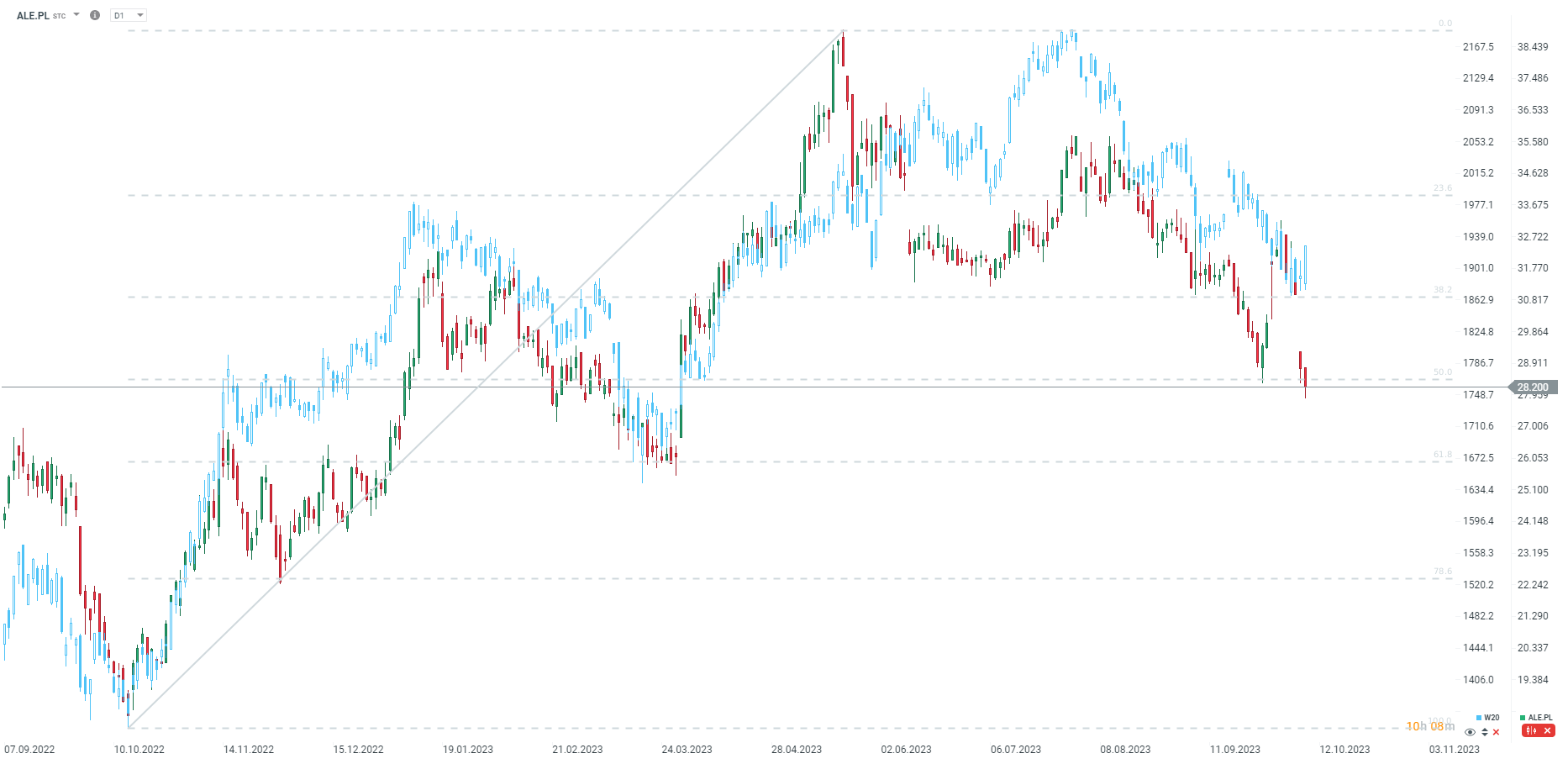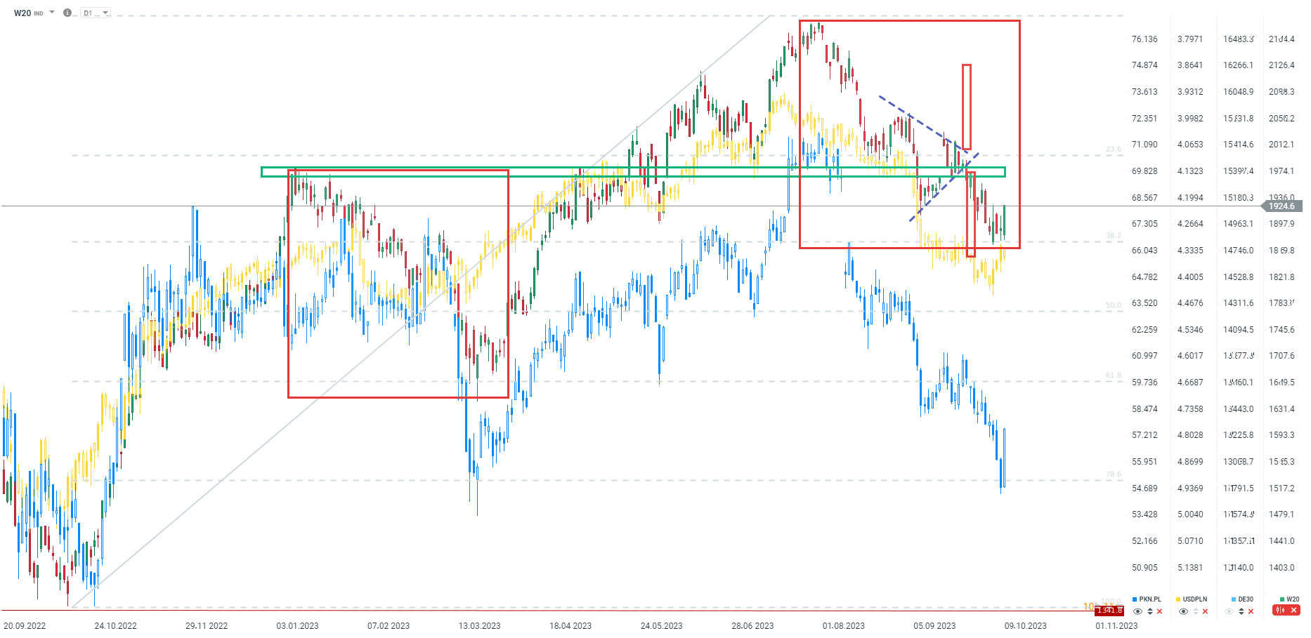 W20 odbija dzisiaj z ważnego wsparcia przy zniesieniu 38.2 i testuje poziom 1920 punktów, co jest związane z lokalnymi dołkami z maja, czerwca i września oraz lokalnych szczytów z zeszłego tygodnia. Obserwujemy również możliwy punkt zwrotny na USDPLN, co może pomóc polskim spółkom. Warto zauważyć, że WIG20 oraz Orlen odbijają dzisiaj najmocniej od wielu tygodni. Źródło: xStation5