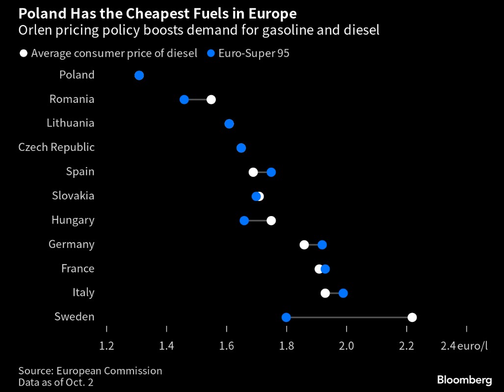 Ceny paliw w Polsce są obecnie najniższe w Europie. Źródło: Bloomberg