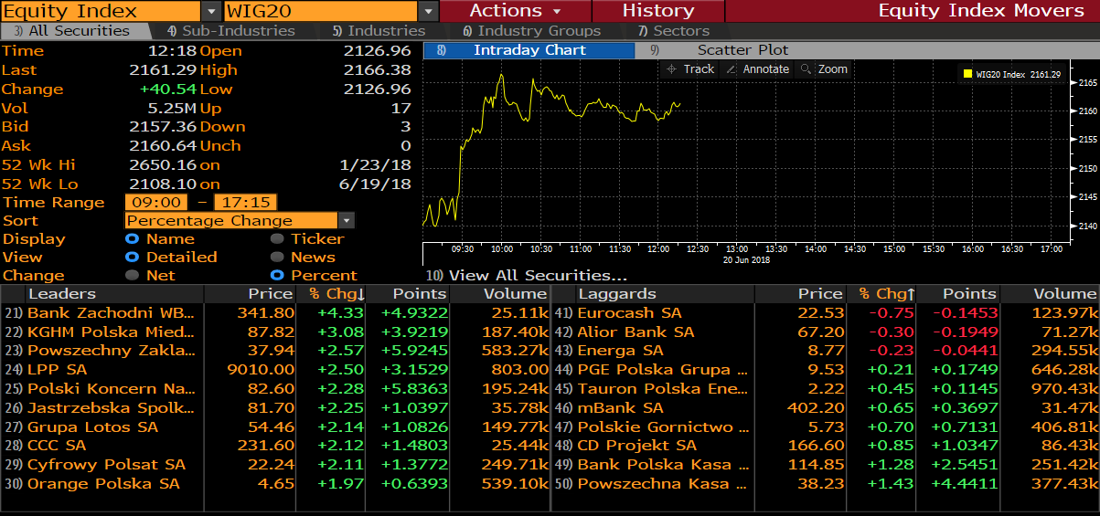Od początku dnia obserwujemy odbicie na światowych parkietach po kilku spadkowych sesjach. WIG20 (W20 na xStation5) o godz. 12:00 notuje wzrost o ponad +1,75%. Napięcie związane z wymianą ognia na linii Biały Dom - Pekin lekko ucichło, co może być powodem lepszych nastrojów na światowych parkietach oraz wzrostowego odreagowania.