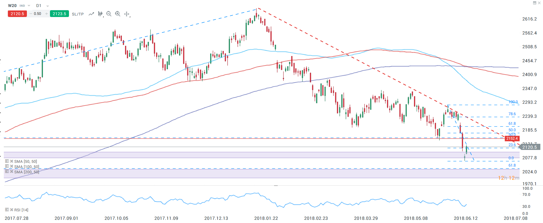 W20 odbił od potencjalnego poziomu wsparcia zlokalizowanego w okolicach 2070-2080 pkt. Najbliższą przeszkodą dla byków mogą być okolice lokalnych dołków zlokalizowanych na poziomie 2150 pkt. Pokrywają się one z poziomem 50% zniesienia ostatniej fali spadkowej. Źródło: xStation5