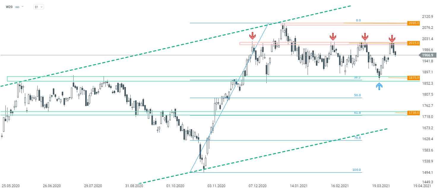 Jeśli chodzi z kolei o sytuację techniczną na WIG20 (W20), notowania znajdują się dziś nieznacznie pod kreską. Patrząc na wykres D1, w tym tygodniu doszło do odbicia od kluczowej strefy oporowej przy 2015 pkt, która wynika z górnego ograniczenia szerokiej konsolidacji. Scenariuszem bazowym pozostaje więc dalszy ruch boczny pomiędzy wsparciem przy 1875 pkt, a wspomnianym oporem przy 2015 pkt.
