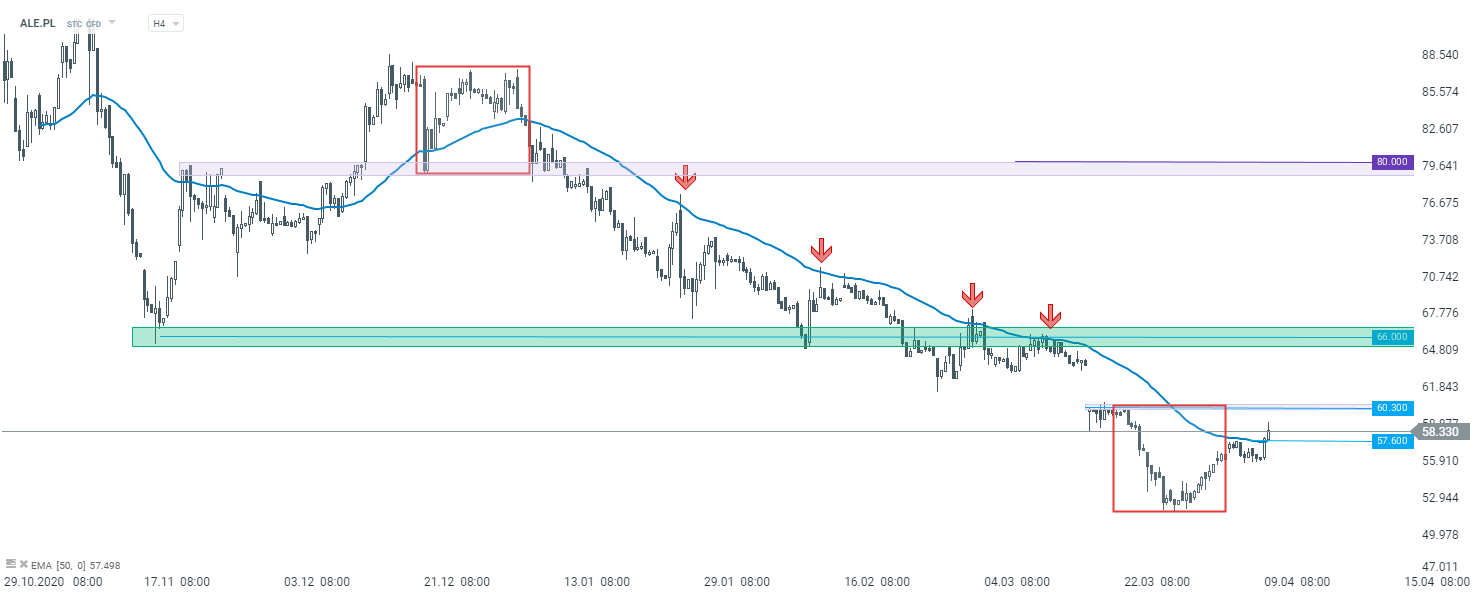 W dzisiejszej analizie przyjrzymy się sytuacji technicznej na Allegro (ALE.PL), gdzie pojawiła się szansa na odreagowanie po ostatnich silnych spadkach. Patrząc na interwał H4, notowania pierwszy raz od połowy stycznia znalazły się powyżej średniej EMA 50, która skutecznie powstrzymywała w ostatnim czasie zapędy rynkowych byków. Aktualnie niewykluczony jest więc atak na opór wynikający z górnego ograniczenia układu 1:1 (czerwone prostokąty, który stanowi największą korektę na całym ostatnim swingu spadkowym. W przypadku jego pokonania, korekta mogłaby się rozszerzyć w kierunku strefy przy 66 zł. Z drugiej strony, powrót poniżej wspomnianej średniej kroczącej, może doprowadzić do powrotu do spadków.