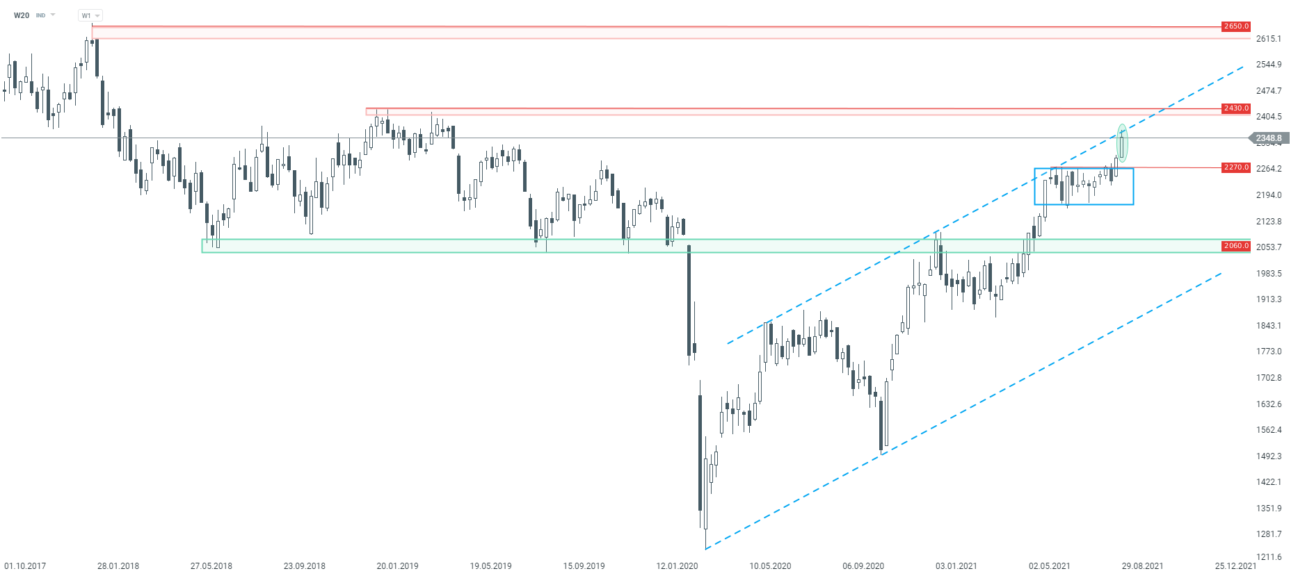 Jeśli chodzi natomiast o sytuację na wykresie WIG20 (W20), w zasadzie nie uległa ona zmianie. Kluczowe dla dalszego kierunku będzie to, jak zakończy się świeca tygodniowa, notowania dotarły bowiem do oporu wynikającego z górnego ograniczenia kanału wzrostowego, gdzie pojawiła się reakcja sprzedających. W przypadku głębszego cofnięcia, jako najbliższe ważne wsparcie należałoby rozważyć górne ograniczenie konsolidacji przy 2270 pkt. Z drugiej strony, w przypadku utrzymania wzrostów, kolejny kluczowy opór znajduje się przy 2430 pkt, gdzie znajdują się szczyty ze stycznia i marca 2019 roku. Dużo może tutaj zależeć od tego jak inwestorzy z USA zinterpretują dane z rynku pracy, na razie nie widać jednak większych spadków na amerykańskim rynku akcji, przez co niewykluczona jest kontynuacja trendu wzrostowego.