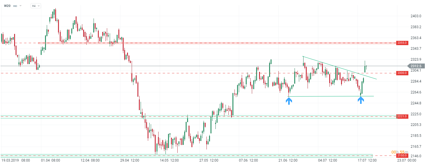 Dzisiaj na polskim parkiecie sporo się dzieje. Giełda w Warszawie wyróżnia się w Europie, zachodnie indeksy znajdują się na bardzo niewielkim plusie. Francuski indeks CAC zyskuje 0,23%, a niemiecka i angielska giełda rosną zaledwie 0,16%. Jeśli chodzi o WIG20, to w piątek możemy obserwować ruch wzrostowy na 0,98%. Dokładnie 1 % rośnie dziś WIG30, z kolei dzisiejszym rekordzistą jest WIG, który znajduje się 1,35% na plusie. Indeksy mWIG40 i sWIG80 również znajdują się powyżej wczorajszego zamknięcia, odpowiednio jest to +0,64% i 0,32%. Jeśli chodzi o sytuację techniczną na W20, rynek próbuje wracać do wzrostów, jak na razie idzie mu to bardzo dobrze. Ostatnie spadki dotarły do dołków z 25 czerwca, po czym kurs ruszył mocno w górę. Jeśli dzisiejszy ruch będzie kontynuowany po weekendzie, istnieje spora szansa na test oporu przy 2355 pkt.