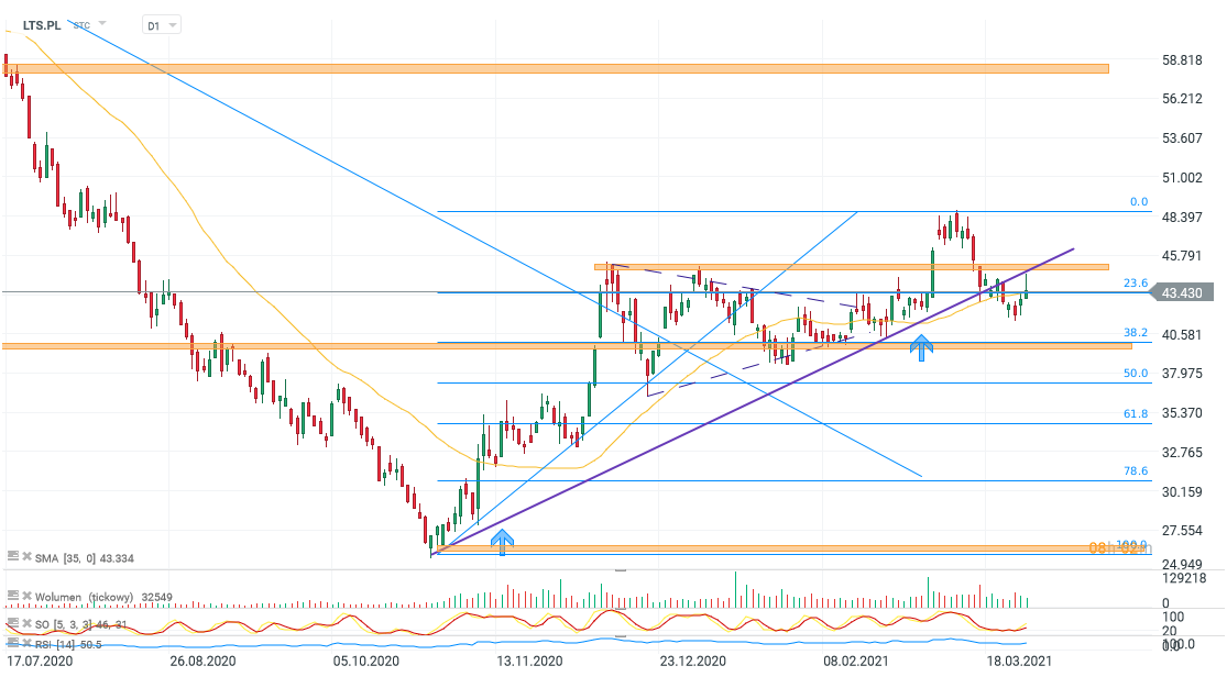 W dzisiejszej analizie technicznej pochylimy się nad spółką Lotos (LTS.PL). Korekta z jaką mierzył się walor trwała od lokalnego szczytu z 11.03.21 tj. 48,70 zł do 25.03.21 osiągając 41,50 zł (rejon wyjścia z formacji trójkąta). W trakcie ostatnich dwóch sesji byki ponownie zaatakowały opór w rejonie 45 zł co rodzi nadzieje na powrót powyżej SMA35 oraz trendu rozpoczętego w listopadzie. Optymisty scenariusz wspierają niskie poziomy wskaźnika RSI oraz oscylatora stochastycznego. Naturalnie, dopiero pokonanie 45 zł oraz w konsekwencji 48,70 zł pozwoli na kontynuację sentyment z początku miesiąca.