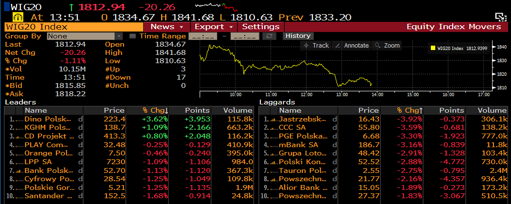 Podczas czwartkowej sesji widać wyraźnie gorsze nastroje na rynku akcji. Jeszcze przed startem handlu za oceanem, główne indeksy w Europie znajdują się na wyraźnym minusie. Pomimo, że na początku dnia sesji było widać pozytywny sentyment, tak sprzedający szybko przejęli kontrolę na rynku. Przed godziną 14:00 niemiecki indeks giełdowy traci 0,7%, francuski CAC40 zniżkuje dokładnie 1%, a londyński FTSE100 znajduje się aż 1,75% pod kreską. Z kolei patrząc na GPW, indeks dwudziestu największych spółek zniżkuje 0,9%. Wśród blue chipów jedynie 3 spółki notują dziś zyski, a pozostałe 17 traci. Na plusie znajdują się akcje Dino Polska, KGHM i CD Projekt, z kolei najmocniej traci mBank, gdzie straty przekraczają już 4%.