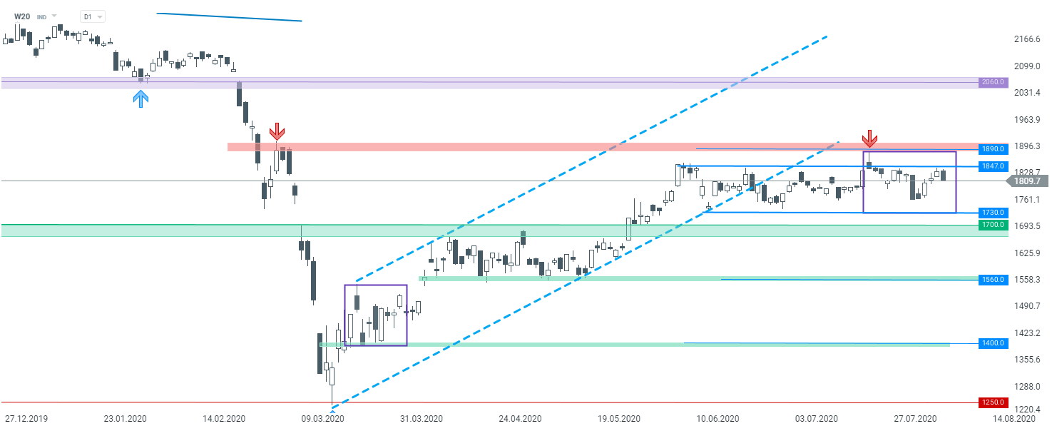 Jeśli chodzi z kolei o sytuację techniczną na indeksie dwudziestu największych spółek WIG20 (W20), pozostaje ona bez większych zmian. Notowania utrzymują się w zakresie wahań pomiędzy poziomem 1847 pkt, a 1730 pkt. Kluczowym oporem w średnim terminie pozostaje z kolei strefa przy 1890 pkt, a jako wsparcie można przyjąć strefę przy 1700 pkt, gdzie znajdują się wcześniejsze reakcje cenowe.