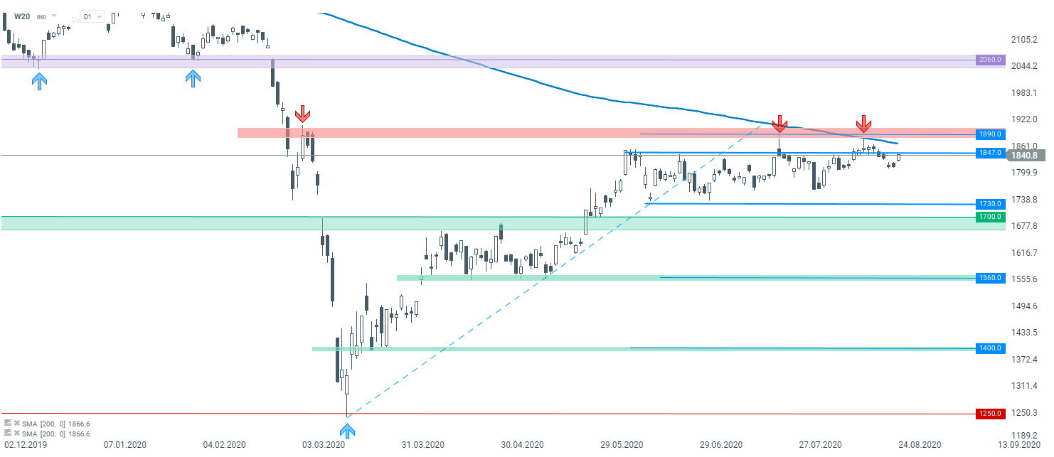 Jeśli chodzi z kolei o sytuację na wykresie WIG20 (W20), ta od dłuższego czasu pozostaje bez większych zmian. Patrząc na interwał dzienny, notowania utrzymują się w szerokiej konsolidacji. Kluczowym oporem pozostają okolice poziomu 1890 pkt. Miejsce to wynika ona z wcześniejszych reakcji cenowych oraz 200 sesyjnej średniej kroczącej. Dopóki notowania znajdują się poniżej, obszaru zaznaczonego kolorem czerwonym, w długim terminie obowiązuje trend spadków. Niemniej trzeba pamiętać, że każdy kolejny test poziomu będzie go osłabiał, przez co ryzyko wybicia górą będzie się zwiększać.