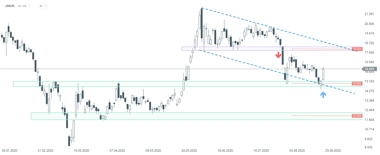 Jastrzębska Spółka Węglowa (JSW.PL). Notowania JSW rosną dziś ponad 6%. Spółka opublikowała w piątek raport za pierwsze półrocze, który pokazał, że znajduje się ona niemal miliard złotych na minusie. W pierwszej reakcji notowania zanurkowały, ustanawiając lokalne minimum przy poziomie 14,40 zł, jednak dalsza część dnia należała do kupujących. W odbiciu pomogły doniesienia o spodziewanej pomocy ze skarbu państwa, mowa tutaj nawet o 1,75 mld zł pożyczki w ramach tarczy antykryzysowej, która mogłaby być w części umorzona.