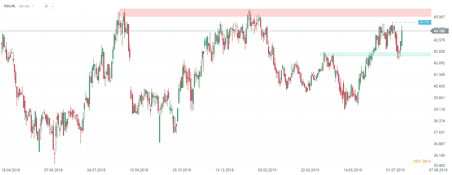 Biorąc pod uwagę poszczególne spółki, należy przyjrzeć się PZU (PZU.PL). Spółka rośnie w środę ponad 2%, tym samym jest to trzecia z rzędu wzrostowa sesja. Dziś pojawiła się informacja, że bank Pekao, który należy do grupy PZU, będzie wdrażał w życie nowy proces zakładania konta, który ma polegać na uproszczonej procedurze weryfikacji klienta – poprzez zdjęcie selfie. Patrząc na sytuację techniczną, droga do tegorocznych szczytów wydaje się otwarta. W ostatnich dniach doszło do obrony ważnego wsparcia. Mowa tutaj o strefie zaznaczonej kolorem zielonym. Co prawda rynek ma jeszcze do pokonania szczyty przy 44,75 zł, niemniej biorąc pod uwagę dynamikę wzrostów, prawdopodobieństwo ich pokonania jest wysokie, niewykluczone, że dojdzie do tego nawet w tym tygodniu. Scenariusz zmieni się na spadkowy dopiero w momencie powrotu ceny poniżej poziomu 42,7 zł.