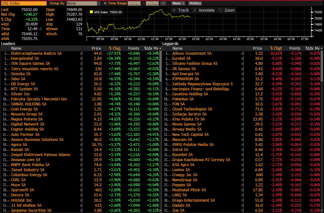 - EC Będzin (BDZ.PL) z blisko 30% rajdem i notujący 20% zwyżkę Energoinstal (ENI.PL) przewodzą wzrostom na GPW