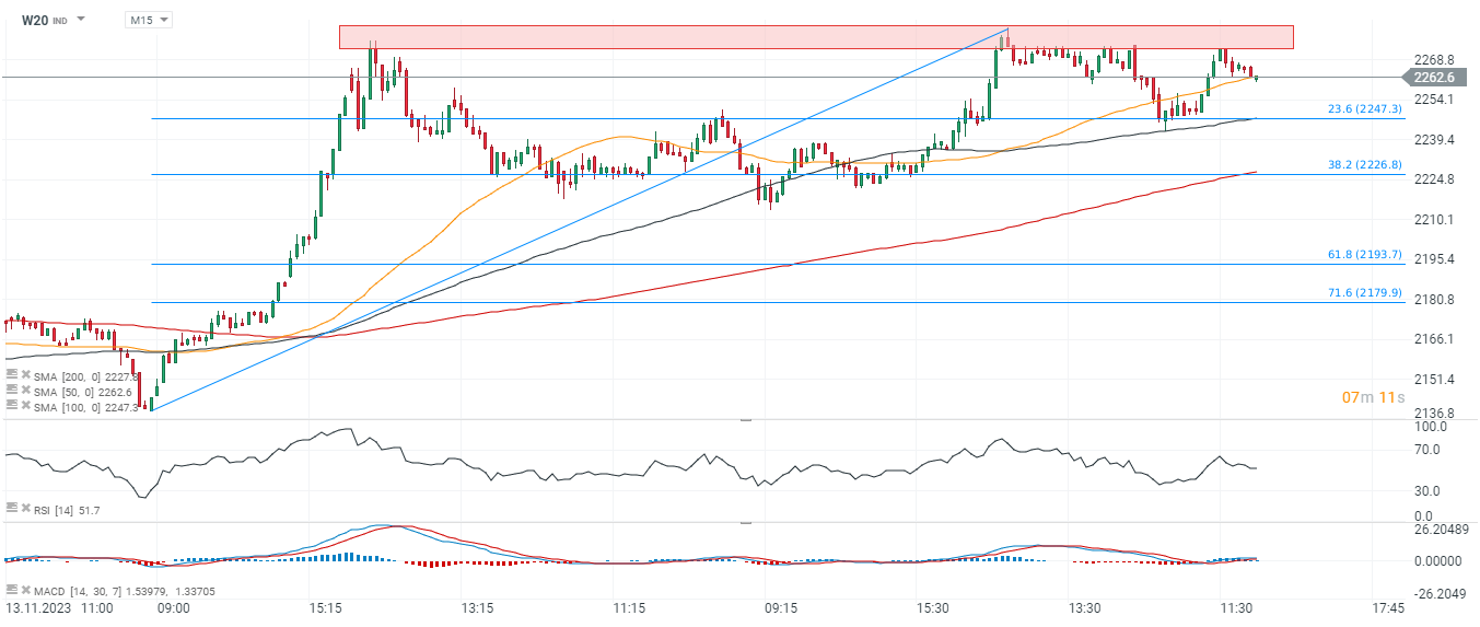 Podaż na W20 trzykrotnie reagowała w rejonie 2300 punktów, a spadek poniżej SMA50 może być sygnałem krótkoterminowej słabości z potencjalnym zakresem korekty do 2240 i 2220 punktów. Źródło: xStation5