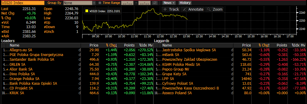 Dzisiejsza sesja na europejskim parkiecie przebiega pod dyktando sprzedających, ale WIG20 podobnie jak niemiecki DAX notowany jest płasko. Spadki mają miejsce na CAC40 i brytyjskim FTSE, gdzie sięgają już blisko 0,8%, po słabej sesji azjatyckiej, na której zniżkowały indeksy chińskie. Dzisiejsze dane makro wypadły pozytywnie dla polskiego rynku akcji, wzrost płac pracowników przedsiębiorstw (powyżej 10 etatów) wyniósł 12,3% r/r zdecydowanie powyżej 11,8% szacowanych przez analityków, którzy oczekiwali nieznacznie niższego odczytu dynami we wrześniu. Produkcja przemysłowa wypadła na poziomie 1,6% i okazała się dodatnia pierwszy raz od 9 miesięcy, choć nie bez znaczenia jest fakt, że październik 2023 miał o jeden dzień roboczy więcej od października 2022, co korzystnie wpłynęło na wynik. Dane w średnim i dłuższym terminie wydają się dobre dla sektora detalicznego i banków, choć dwukrotnie wyższa dynamika płac na tle inflacji (6,6%) sugeruje, że walka z presją cenową przy mocnym popycie wewnętrznym w gospodarce może być utrudniona.