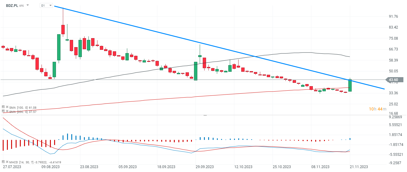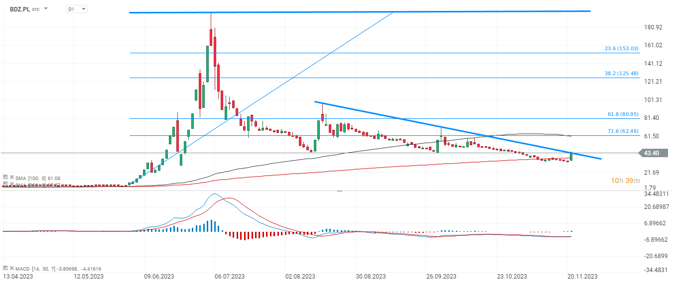 Akcje EC Będzin próbują wydostać się ze struktury spadkowej i testują linię spadkowego trendu. Potencjalne zamknięcie sesji w okolicach 45 -50 PLN może sugerować przynajmniej krótkoterminowe odwrócenie trendu. Źródło: xStation5