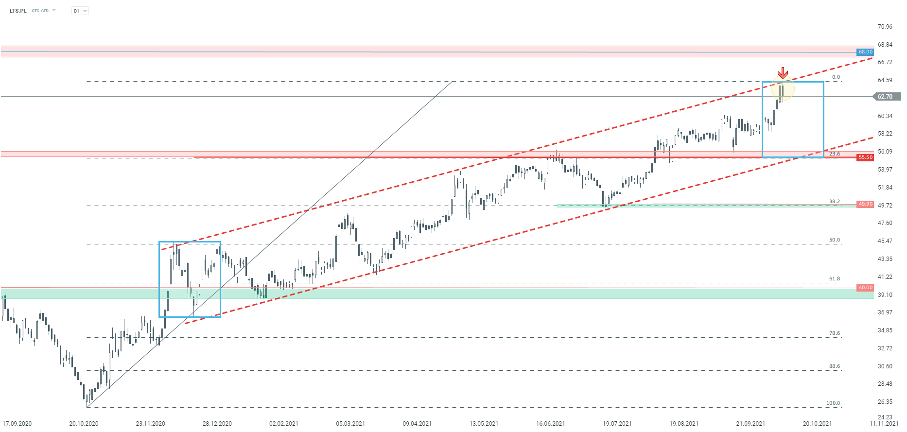 W dzisiejszej analizie spojrzymy na sytuację techniczną na Lotos (LTS.PL), gdzie obserwujemy odbicie od oporu wynikającego z górnego ograniczenia kanału wzrostowego. Jeżeli korekta spadkowa się pogłębi, to jako kluczą strefę wsparcia należy traktować okolice 55 zł. Miejsce to wynika z dolnego ograniczenia wspomnianego kanału, a także mierzenia 23,6% Fibonacciego, jak i układu 1:1. Z drugiej strony, w przypadku wybicia się górą z kanału wzrostowego, ruch może przyspieszyć w kierunku kolejnej strefy oporu przy 68 zł.