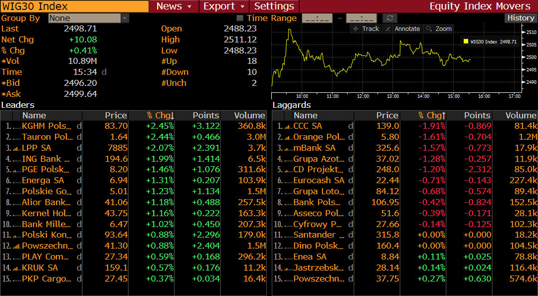 Spółki z indeksu WIG30 o godzinie 15:34. Źródło: Bloomberg