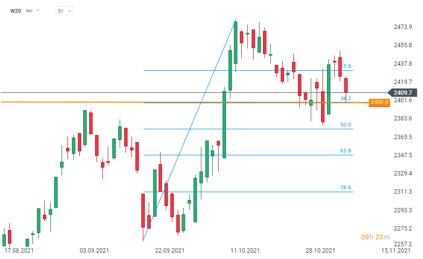 Indeks WIG20 (W20) testuje obecnie kluczowe wsparcie na poziomie 2400 punktów. Trwałe wybicie dołem, może doprowadzić do pogłebienia ruchu spadkowego nawet w okolice poziomu 2374 punktów, który wynika ze zniesienia 50% Fibonacciego. Dla strony popytowej kluczowym jest obrona poziomu 2400, która jeśli okaże się udana, może doprowadzić do kontynuacji wzrostów w okolice 2440. Źródło: xStation 5