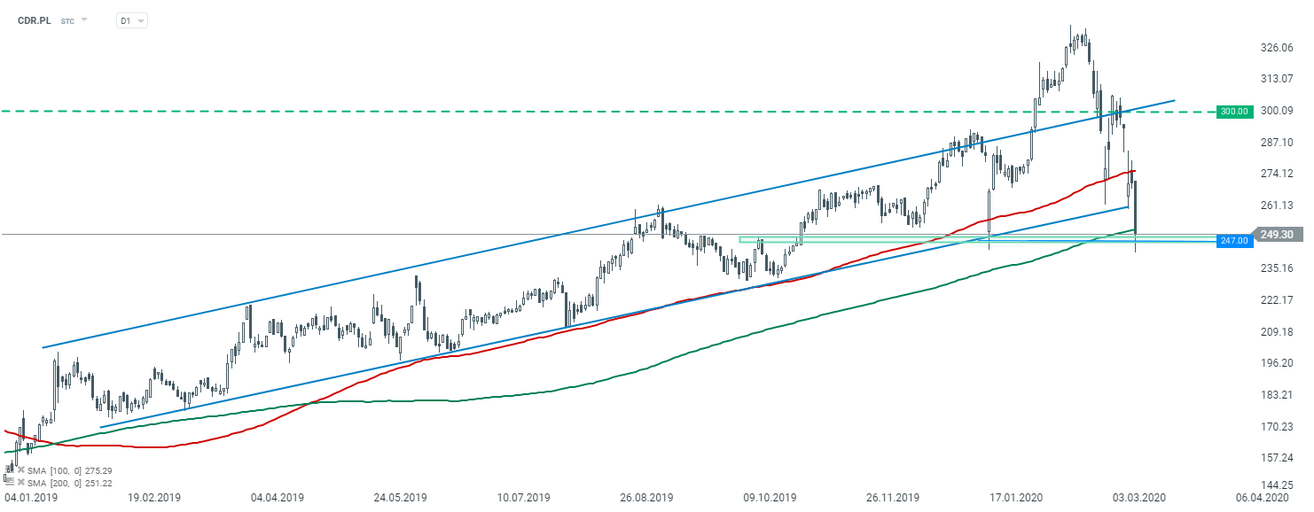 Z potężną wyprzedażą mamy dziś do czynienia na spółce CD Projekt (CDR.PL), akcje tracą dziś ponad 8%! Sytuacja techniczna wygląda bardzo ciekawie. Pierwszy raz od dłuższego czasu mamy do czynienia z utrzymaniem się kursu poniżej 100 - okresowej średniej kroczącej, która została zaznaczona na poniższym wykresie czerwoną linią. Dodatkowo doszło do wybicia dołem z kanału wzrostowego, co może zapowiadać większą przecenę. Pomimo, że branża gamingowa nie zostanie prawdopodobnie dotknięta koronawirusem (jeśli ludzie zostaną w domach to i tak będą mogli grać w gry), to panujące nastroje na światowym rynku akcji prowadzą do obserwowanej przeceny również na spółkach gamingowych. Patrząc technicznie na interwał D1, aktualnie testowana jest SMA200, gdzie może pojawić się reakcja kupujących, Kolejne wsparcie wypada znacznie poniżej - przy poziomie 247 zł, gdzie znajdują się wcześniej reakcje cenowe, w tym istotny dołek z 17 stycznia, który został wyznaczony po informacji o przełożeniu premiery Cyberpunka. Jeśli poziom zostanie złamany, spółka może wkroczyć na dobre w trend spadkowy.