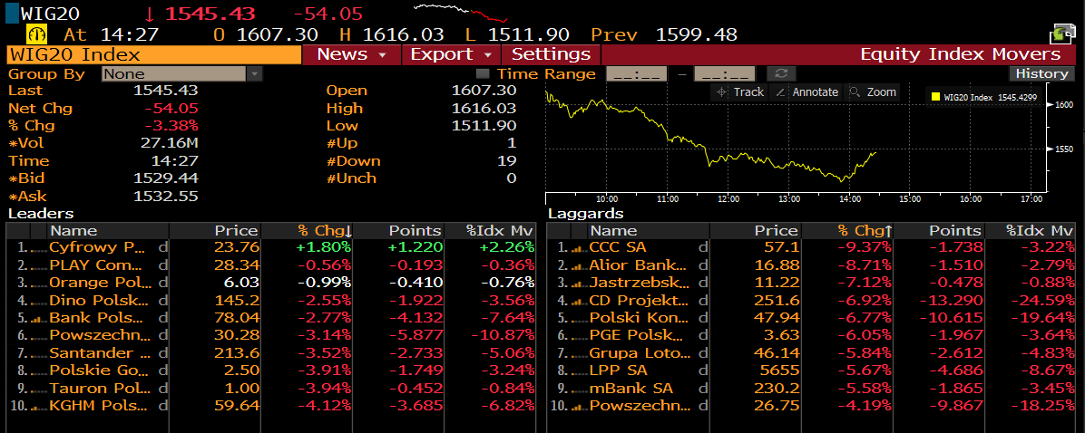 Podczas dzisiejszej sesji europejskie rynki akcji próbowały odrabiać straty, jednak aktualnie większość porannych wzrostów została wymazana. Dziś rano Bank Anglii zdecydował się na nadzwyczajne cięcie stóp procentowych o 50 punktów bazowych w związku z niepokojami odnośnie rozszerzającej się epidemii koronawirusa, niemniej reakcja na rynku akcji była chwilowa. W środę polska giełda radzi sobie najgorzej w Europie, indeks dwudziestu największych spółek tracił dziś nawet ponad 5%, tym samym notowania znalazły się na poziomach nie widzianych od 2009 roku! Ma to związek z działaniami podjętymi przez polski rząd, który wprowadza kolejne ograniczenia. Zgodnie z zapowiedziami premiera, podjęto decyzję o zamknięciu wszystkich placówek oświatowych, a także instytucji kultury, takich jak kina czy teatry. Wśród blue chipów jedynie Cyfrowy Polsat znajduje się dziś na plusie (+1,8%), z kolei pozostałe 20 spółek notuje straty. Najgorzej radzi sobie CCC, gdzie przecena w pewnej chwili przekroczyła 10%.