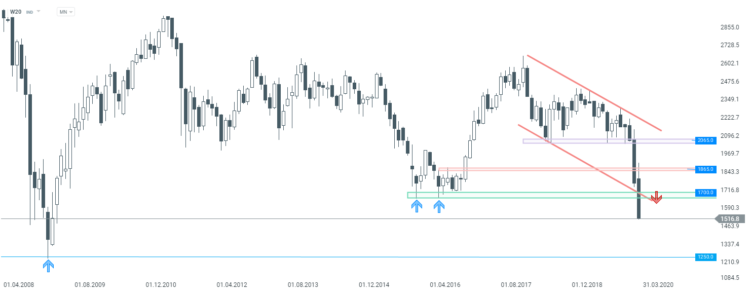 Sytuacja techniczna nie uległa większej zmianie, wciąż jest ona bardzo, bardzo kiepska. Tak jak wskazaliśmy w poprzednich analizach, dopóki indeks znajduje się poniżej 1700 pkt., jednym słusznym scenariuszem są dalsze spadki. Wczoraj przedstawiliśmy sytuację na interwale D1, a dziś wróćmy do wykresu miesięcznego. Raczej nikt nie spodziewał się aż tak kolosalnej wyprzedaży i gdy mówiło się o poziomach 1200-1300 pkt wydawało się to nieosiągalne, niemniej patrząc na interwał MN, wcale nie są one nierealne. Biorąc pod uwagę dynamikę spadków i wcale nie tak dużą liczbę przypadków koronawirusa w Polsce, przecena może się pogłębić. Szukanie dołka z pewnością nie jest dobrym pomysłem, jednak ewentualne odbicie na wysokości minimów z 2019 roku z pewnością będzie dobrym miejscem do wykonania większego odreagowania wzrostowego. Każda panika kiedyś się kończy.
