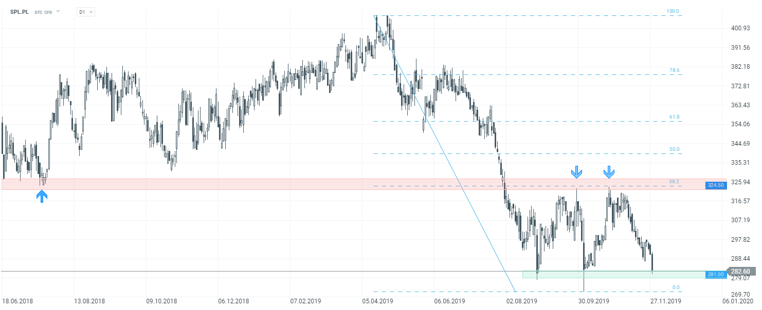 Wspomniany jednak sektor bankowy radzi sobie dziś bardzo słabo. Wszystko za sprawą kluczowej decyzji Sądu Najwyższego, odnośnie możliwości przewalutowania kredytów frankowych po stopie z dnia zawarcia kredytu. Czwartkowym spadom przewodzą właśnie Alior Bank, Santander Bank Polska i PKO BP. W jednym z ostatnich artykułów z cyklu “Puls GPW” przedstawiliśmy sytuację techniczną na Alior Banku, dziś skupimy się na marce Santander. Patrząc na wykres SPL.PL, doszło dziś do testu kluczowego wsparcia. Strefa zaznaczona kolorem zielonym przy 281 zł za akcję wynika z położenia dołka sierpnia tego roku. Jeżeli w tym miejscu pojawi się reakcja kupujących, będzie do dobre miejsce do odbicia. Niemniej sygnał wiarygodny sygnał wzrostowy pojawi się dopiero w momencie wybicia strefy oporowej przy 324,5 zł.