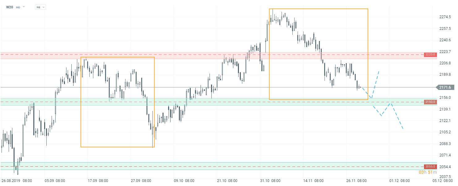 W20 zgodnie z ostatnimi założeniami kontynuuje spadki. Kurs dotarł dziś do minimów z 21 listopada i jak na razie nie widać tutaj chętnych do kupna. Tym samym istnieje spora szansa na zejście w kierunku wsparcia przy 2150 pkt. Najbliższa strefa zaznaczona kolorem zielonym wynika z dolnego ograniczenia układu Overbalance, a także z wcześniejszych reakcji ceny. Warto wspomnieć, że jutro tzw. “Black Friday”, na którym mogą skorzystać nie tylko konsumenci, ale także banki (posiadające duży udział w indeksie WIG20), które przygotowały specjalną ofertę pożyczek z racji dnia wyprzedaży. Z tego też powodu ewentualne zejście w rejony wspomnianego wsparcia technicznego, może okazać się dobrym miejsce do wygenerowania kolejnego impulsu wzrostowego, bądź chociaż większej odbicia. Z drugiej strony trzeba pamiętać, że sektor bankowy znajduje się w ostatnim czasie pod presją, głównie przez kredyty frankowe, co jest dużo poważniejszą sprawą w dłuższym terminie.