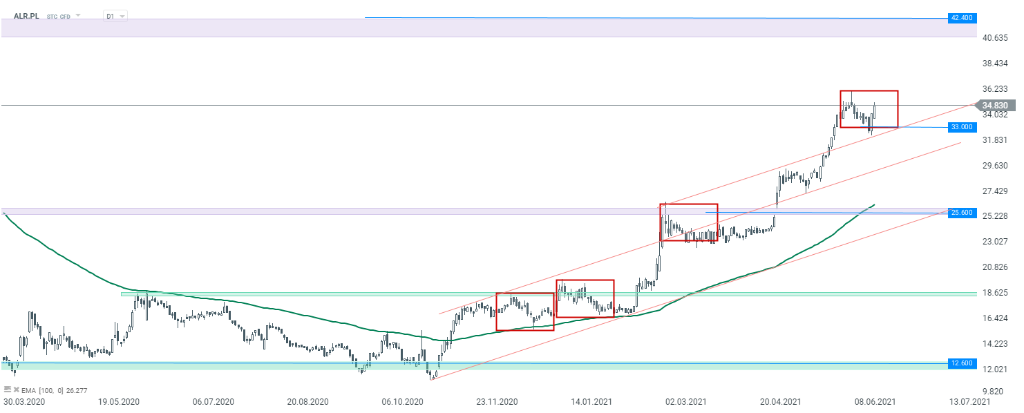 Spójrzmy na wykres Alior Banku (ALR.PL), który zyskuje dziś ponad 2%. Kurs odbił po przetestowaniu linii poprowadzonej po dwóch niedawnych wierzchołkach. Jako wsparcie można obecnie uznać dolne ograniczenie struktury 1:1 w trwającym trendzie wzrostowym (33 PLN). Walory Alior Banku poruszają się od jesieni 2020 w ciekawym schemacie - po okresach konsolidacji następowały dynamiczne wybicia - w ramach formacji flagi bądź chorągiewki. Obecne schłodzenie kursu trwa relatywnie krótko wobec tych obserwowanych w ostatnich miesiącach, stąd górne ograniczenie układu 1:1 może stanowić poziom oporu.