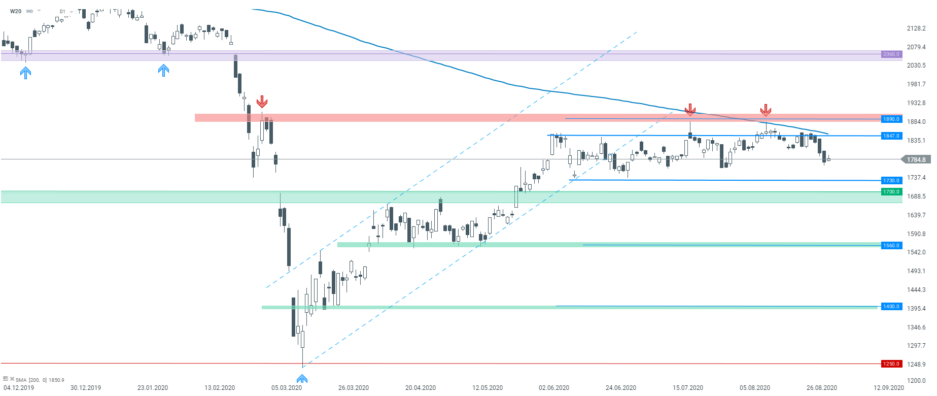 Patrząc z kolei na sytuację techniczną na indeksie dwudziestu największych spółek - WIG20 (W20), ta od dłuższego czasu pozostaje bez większych zmian. Po nieudanej próbie wybicia górą oporu przy 1890 pkt, notowania powoli schodzą do dołu. Ponadto widać, że kurs nie ma siły na wyście powyżej 200-okresowej średniej kroczącej, która została zaznaczona na poniższym wykresie kolorem niebieskim. Pomimo dzisiejszych wzrostów, wciąż istnieje ryzyko zejścia w kierunku dolnego ograniczenia konsolidacji, czyli w okolice poziomu 1730 pkt. Gdyby przecena była silniejsza, kolejna strefa znajduje się rejonach 1700 pkt.