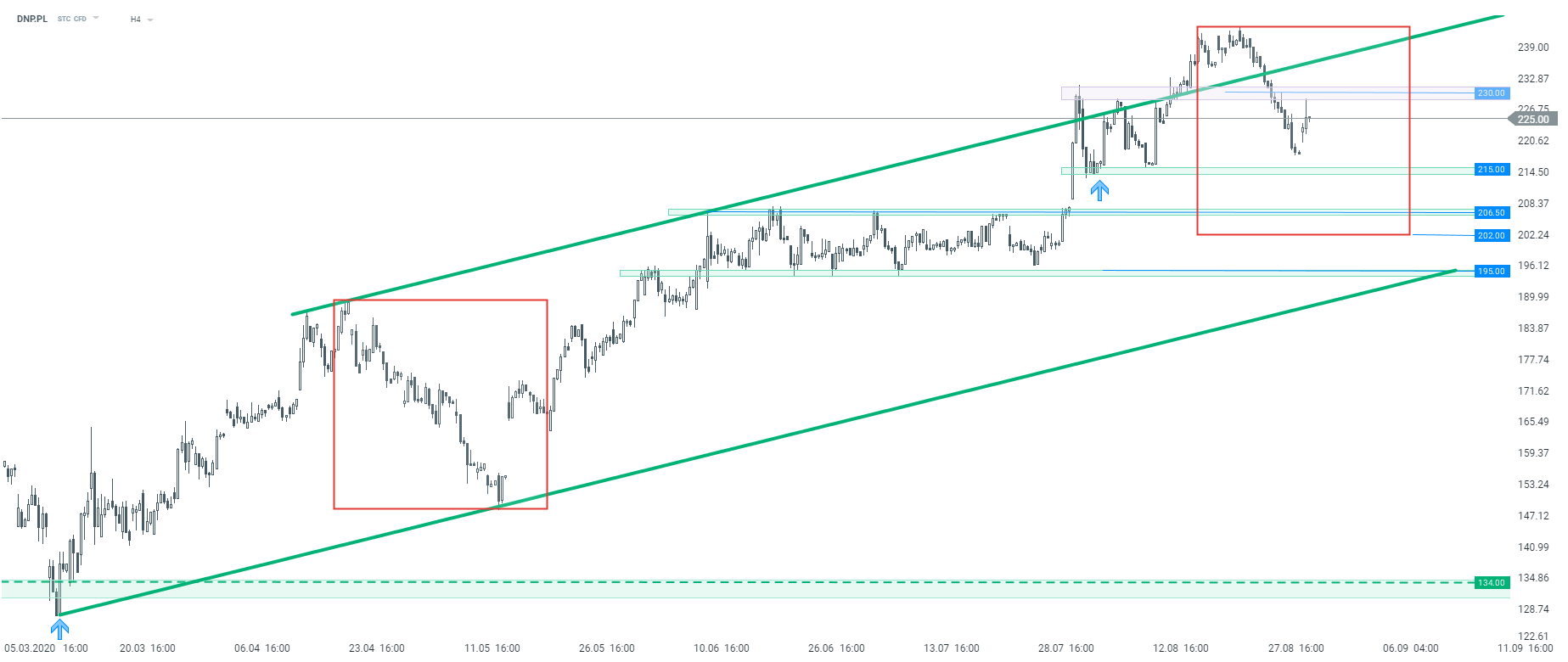 W dzisiejszej analizie przyjrzymy się wykresowi Dino Polska (DNP.PL), gdzie po kilku spadkowych sesjach możemy obserwować reakcję strony popytowej. Patrząc na wykres H4, ostatni ruch w dół należy traktować jedynie jako korektę w trendzie wzrostowym.Najbliższe wsparcie wypada przy poziomie 215 zł, gdzie znajdują się wcześniejsze reakcje cenowe. Gdyby przecena była silniejsza, kolejne ważne poziomy zostały zaznaczone na poniższym wykresie kolorem zielonym. Z kolei kluczowym oporem pozostaje strefa w rejonach 230 zł, jej pokonanie, może otworzyć drogę do większych wzrostów.