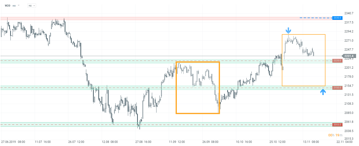 Patrząc technicznie na W20, notowania zbliżają się do kluczowej strefy oporowej. Jeżeli obszar zaznaczony kolorem zielonym przy 2220 pkt nie powstrzyma przeceny, to spadki mogą sięgnąć nawet strefy przy 2150 pkt, gdzie znajduje się dolne ograniczenie układu Overbalance, który jest największą korektą spadkową w całym swingu wzrostowym, licząc od sierpnia tego roku.