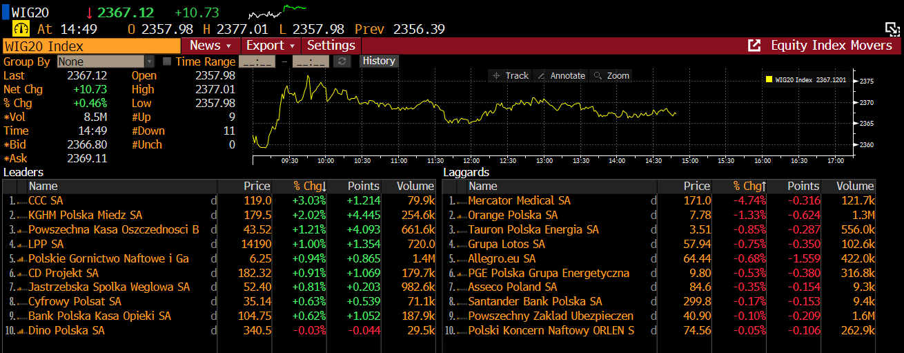 Wśród blue chipów pozytywnie wyróżniają się dziś walory CCC, które rosną o 3% po informacji o objęciu obligacji przez jeden z funduszy PFR. Na drugim końcu tabeli znajduje się Mercator Medical, który silnie zniżkuje po komunikacie o obniżeniu szacunkowego zysku w II kwartale (wątek poruszaliśmy w naszym wpisie przed godz. 12:00).