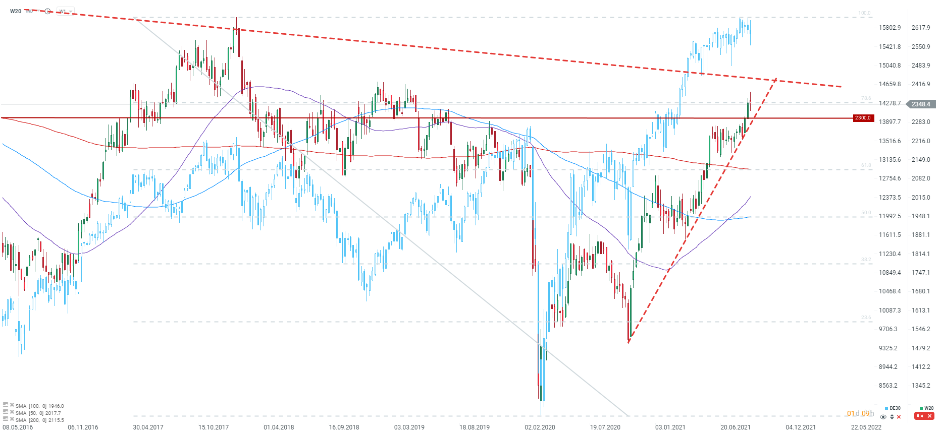 Ten tydzień może zakończyć się niewielkim spadkiem indeksu WIG20 (W20). Indeks zaliczył test lokalnych szczytów z początku 2019 roku, blisko poziomu 2400 punktów. Wyjście powyżej tego poziomu oraz powyżej długoterminowej linii trendu spadkowego może pozwolić na przetestowanie bardzo ważnej strefy oporu przy 2600 punktów, gdzie znajdują się m.in. szczyty z 2017 roku oraz wcześniej z okresu 2012-2015. Z drugiej strony kluczowe wsparcie to okolice poziomu 2300 punktów.