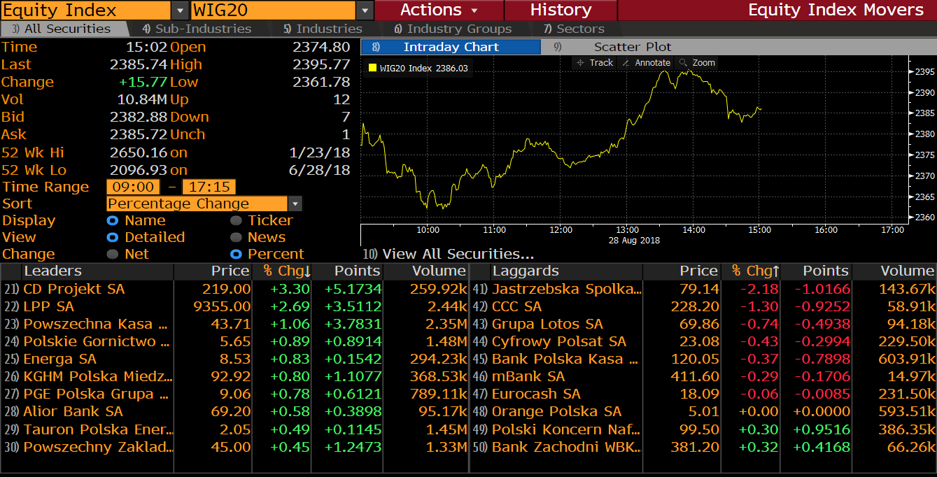 Swoje wyniki opublikował także CD Projekt. Spółka w II kwartale miała 29,5 mln zł. zysku netto, co jest wynikiem powyżej oczekiwań rynkowych, które plasowały się na poziomie 26,6 mln zł. Inwestorzy wyczekiwali jednak konferencji prasowej, na której głos zabrał prezes Adam Kiciński. Nie zabrakło zmianek na temat nowej produkcji “Redów” - Cyberpunk 2077. Grupa cały czas pracuje nad ostateczną wersją gry, a to co zostało upublicznione w game play, niekoniecznie musi wyglądać jak ostateczna wersja. Oficjalny Gameplay jest dostępny szerokiej publiczności od wczoraj w serwisie Youtube. Wcześniej był pokazywany za zamkniętymi drzwiami na targach E3 w Los Angeles w czerwcu oraz na niedawnym Gamescom. W ciągu niecałych 24 godzin 48-minutową próbkę gry obejrzało ponad 3 miliony użytkowników. Jest to bez wątpienia ukłon w stronę graczy. Również inwestorzy ostatnie informacje przyjęli dosyć ciepło, a CD Projekt w II części sesji rośnie ponad 3% i zbliża się do historycznych maksimów.
