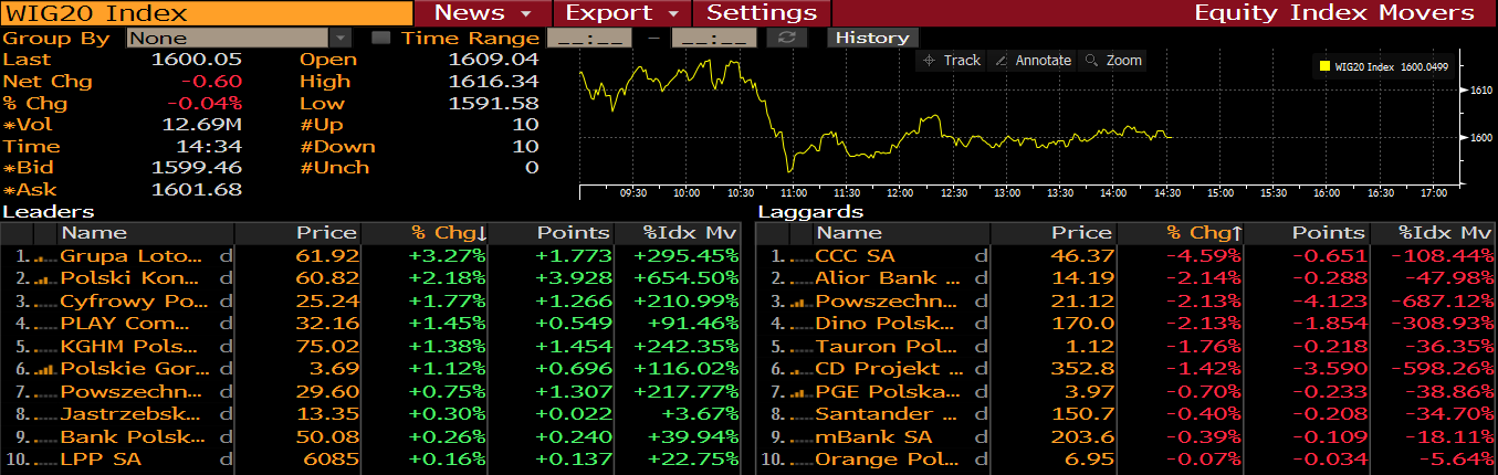 Przyczyną dzisiejszych spadków, a bardziej braku wzrostów jest dzisiejszy wyrok Trybunału Konstytucyjnego Niemiec, który wskazuje, że wprowadzony przez EBC program skupu aktywów nie jest do końca zgodny z niemiecką konstytucją. W odpowiedzi na tę wiadomość DAX zaczął dynamicznie spadać po godzinie 10:30, podobnie jak inne europejskie indeksy. W kolejnych godzinach większość tego ruchu została wymazana na niemieckiej giełdzie, podczas gdy WIG20 już się nie podniósł.