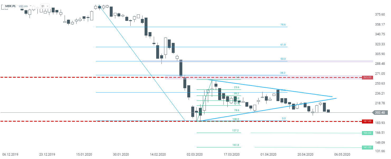 W dzisiejszej analizie przyjrzymy się spółce mBank (MBK.PL), gdzie obserwujemy ponad 2% przecenę. Generalnie cały sektor bankowy znajduje się w ostatnim czasie pod kreską, niemniej patrząc technicznie na wykres D1, na akcjach banku doszło do wybicia dołem z formacji trójkąta. Zgodnie z klasycznymi założeniami analizy technicznej należy więc oczekiwać kontynuacji spadków. Aktualnie najbliższe wsparcie może stanowić poziom 187 zł akcję, gdzie znajdują się ostatnie minima. Niemniej w przypadku wybicia nowych dołków, spadki mogą się pogłębić w kierunku mierzeń zewnętrznych Fibo - 127,2% oraz 161,8%.